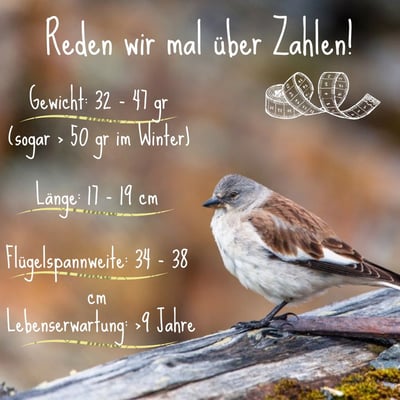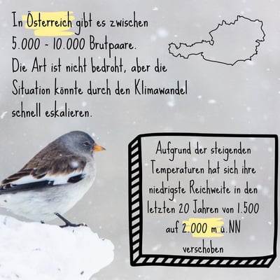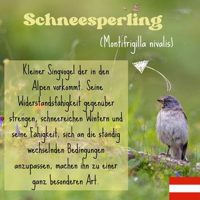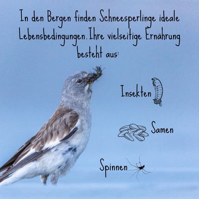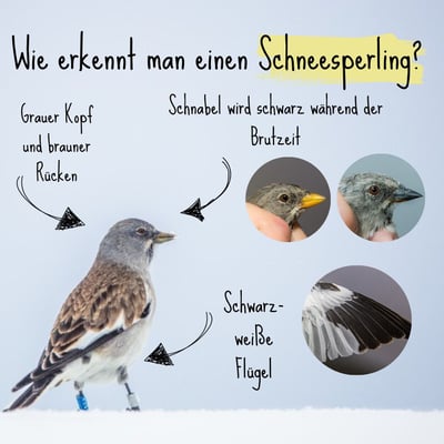 Der Schneesperling (Montifringilla nivalis) ist ein kleiner Singvogel mit schwarz-weißen Flügel und kommt ab einer Höhe von 2000m ü.NN vor. Als Spezialist ist der Vogel perfekt angepasst an die harten Bedingungen in den Bergen. Klimaveränderung stellt jedoch eine Herausforderung für diese Art da, mit noch teils unklaren Folgen.