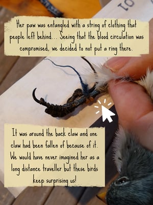 Bemerkenswert: Sie hatte eine schwere Fußverletzung, verursacht durch einen Faden (vermutlich aus Kleidung), der sich fest um die Zehen gewickelt hatte und deren Absterben drohte. Deshalb wurde damals auf eine Farbberingung verzichtet.