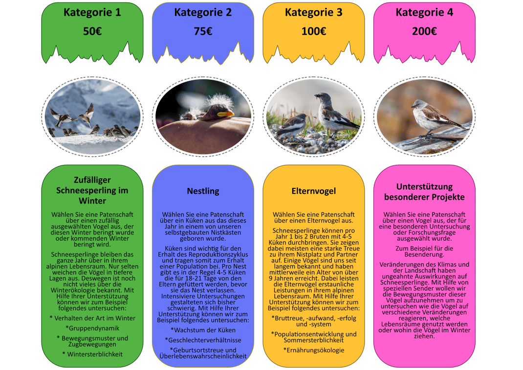 Übernehmen Sie eine Patenschaft für einen Schneesperling – als Dank erhalten Sie eine persönliche Urkunde mit Informationen zu „Ihrem“ Vogel: Alter, Geschlecht und Gesundheitszustand